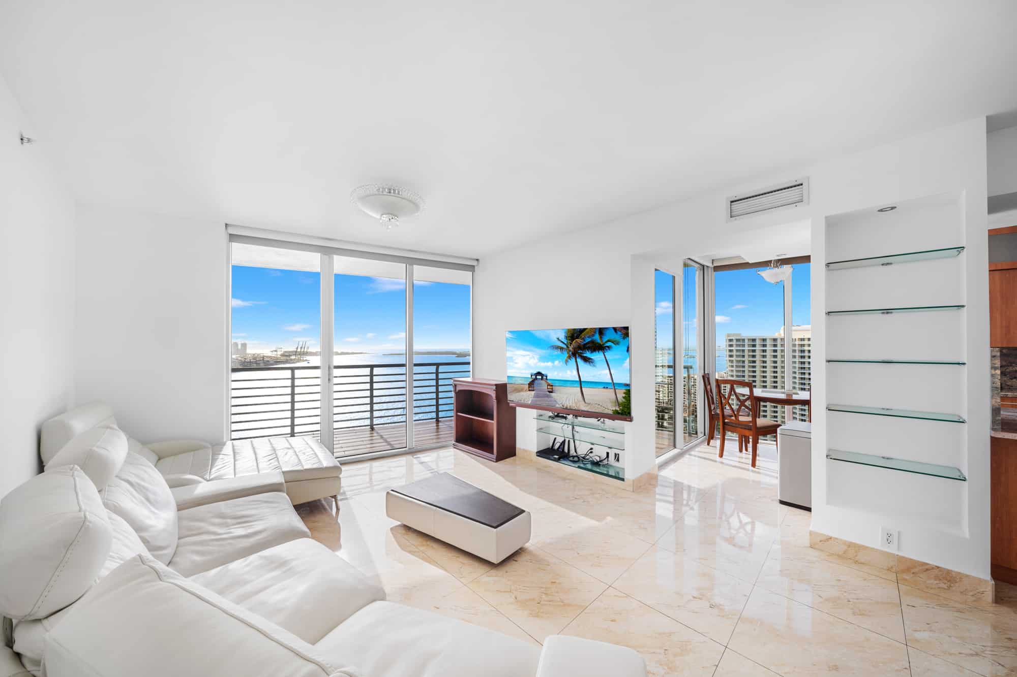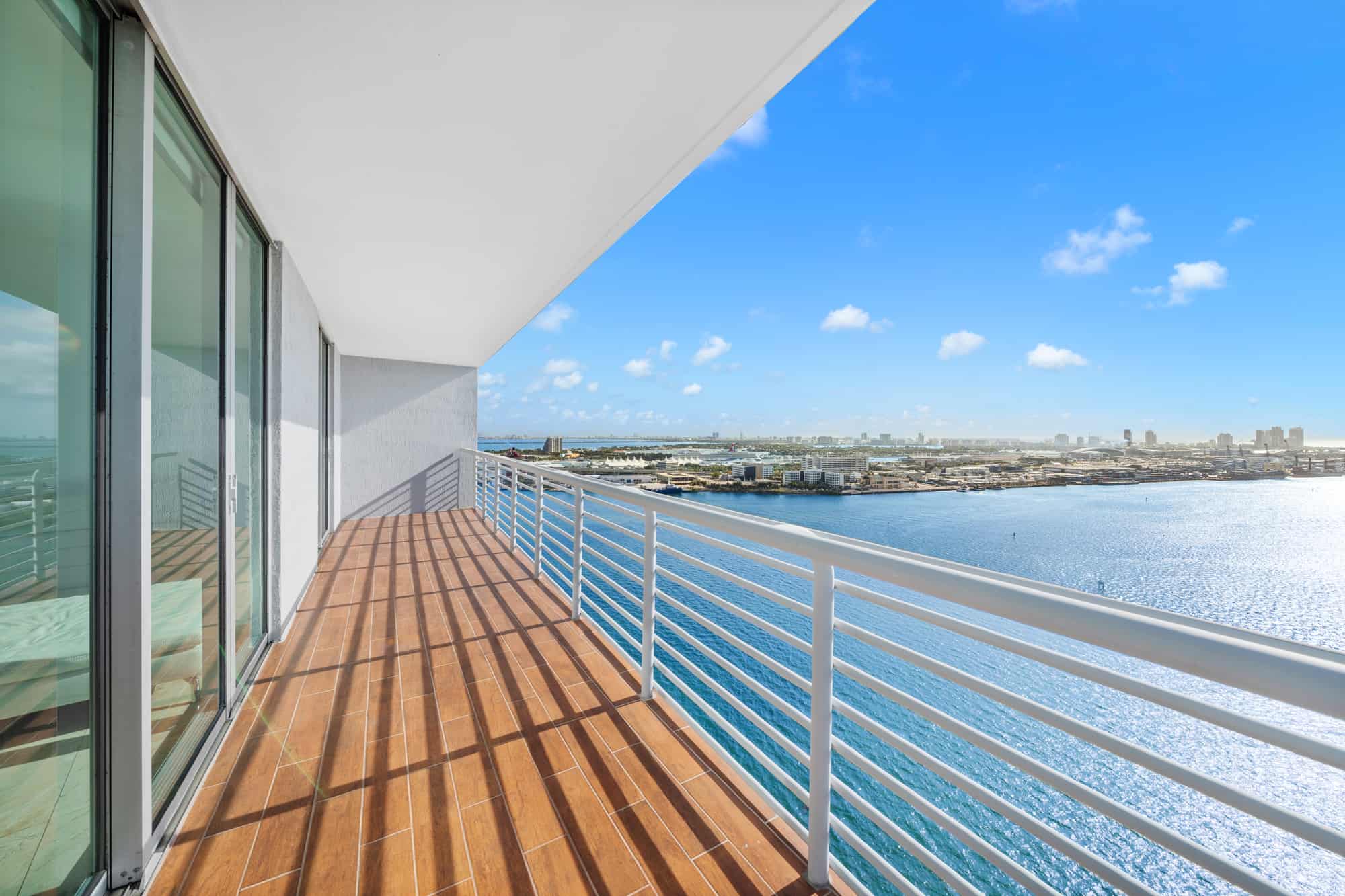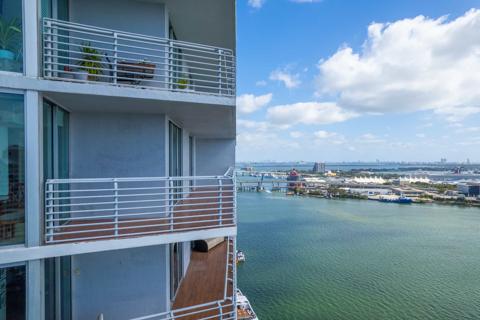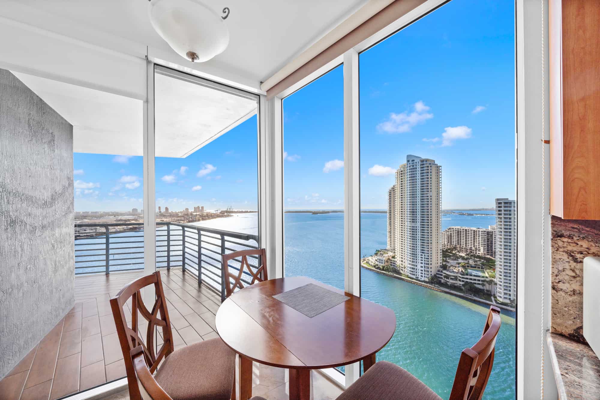- Residences, party, and amenity decks offer spectacular and dramatic views of Biscayne Bay, Port of Miami, Brickell Avenue, Downtown Miami, South Beach, and Key Biscayne